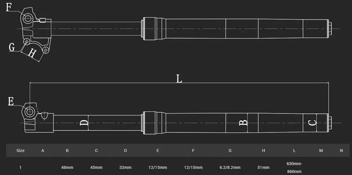 Jednoduchá nastavitelná obrácená přední vidlice Pit Bike se vyznačuje špičkovým obráceným designem, který zvyšuje tuhost a stabilitu a poskytuje vynikající ovladatelnost na nerovném terénu. Tato inovativní struktura snižuje těžiště a zlepšuje celkovou rovnováhu motocyklu, zejména při vysokorychlostních manévrech. Nastavitelný systém tlumení navíc umožňuje jezdcům přizpůsobit nastavení odskoku, což umožňuje rychlou adaptaci na různé jízdní podmínky. Díky těmto výhodám Pit Bike Single Adjustable Inverted Fork nejen zvyšuje výkon, ale také zvyšuje zážitek z jízdy pro nadšence pitbiků.
